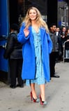 Blake left the premiere wearing the same over-the-knee boots and gloves but swapped her figure-hugging dress for a black and white floral one. The following morning, the actress went on Good Morning America, and she opted for luxurious quilted Fendi shorts from the Spring 2020 runway, complete with a sequined checked jumper. My favorite look thus far has to be the cobalt blue teddy-bear coat she wore while going to The Kelly and Ryan Show. She styled the Cookie Monster-inspired coat with a blue and white Ulyana Sergeenko dress and matching blue Christian Louboutin heels. See more glimpses of Blake's press tour looks ahead.