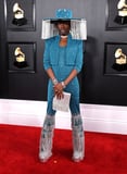 Billy Porter knows how to bring the glitz and glam to any occasion, and the Pose star truly channeled his inner Evangelista as he walked the 62nd annual Grammys red carpet on Sunday in an aqua Baja East jumpsuit with rhinestone bell-bottoms and a matching wide-brim hat that holds a very glamorous secret. The fringe-covered hat - designed by Sarah Sokol Millinery - was inspired by Billie Eilish's beekeeper-esque Burberry chain mask at the American Music Awards, according to his stylist Sam Ratelle, and features a curtain of jewels that can be opened and closed with the push of a button - now that is a look.