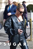 Hailey Bieber has made her way over to Paris Fashion Week. While attending the Christian Dior show on Tuesday at Tuileries Garden, Hailey opted for a full leather look. The 23-year-old model joined friends like Gigi Hadid and Cara Delevingne at the star-studded runway show. For the show, Hailey wore a three-piece leather ensemble by Copenhagen-based brand Saks Potts. She styled a leather tube top with a matching jacket and pants. If you look closely, you'll notice that the leather pieces were embossed with the brand's SP logo.