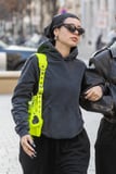 There's a new It bag in town, and Alexa Demie just gave it her stamp of approval. A few days after her Paris Fashion Week appearance at the Balenciaga fall 2022 show (for which she brought back the controversial skirt-over-pants trend), the "Euphoria" actor stepped out with longtime friend actress Taylor Russell, carrying a neon-green Le Cagole shoulder bag. The recognizable Balenciaga design brightened up Demie's casual outfit, which consisted of a dark gray hoodie, loose black sweatpants, and a black headscarf which showed a glimpse of her new micro bangs.