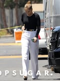 Jennifer Lopez has been visiting fiancé Ben Affleck on set of his latest project in LA, showing up in sophisticated street style ensembles daily. From a casual jumpsuit to a bohemian-inspired flared jeans look, she keeps the outfit inspiration coming. On July 5, Lopez arrived in white high-rise, wide-leg denim from Et Ochs. The jeans feature subtle contrast stitching and a flowing hem, complete with logo hardware on the back right pocket. She cinched her waist with a gold Hermès belt and added hoops from Jennifer Fisher to match.