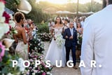 Opting for natural waves, she pinned white flowers to her hair to match her bouquet and finished the look with diamond stud earrings. Noah coordinated at the barefoot ceremony in an ivory double-breasted tuxedo worn over a relaxed white button-down, adding a gold chain-link bracelet and round, translucent sunglasses for a '70s-inspired touch.