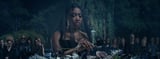 The following scene brings us into a staged outdoor funeral, where Megan pulls back the veil to clearly reveal her smoky makeup. Moments after, we see her clad in an all-white outfit, consisting of a majestic wide-brim hat and a silky cowlneck slipdress. A pair of silver earrings and white sandals round out the elegant look.