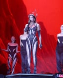 The four-day Lollapalooza festival returned on Thursday, July 28, with a star-studded lineup and a massive crowd of music fans in Chicago. Dua Lipa was among the performers who wowed the crowd on day two, wearing a look that's become her stage uniform since her "Future Nostalgia" tour. The singer sparkled in a bedazzled Mugler catsuit covered in sequins. It featured a corseted top with sheer panel cutouts at the midsection and long leggings that were slashed with the same cutouts. Lipa accessorized with matching gloves and topped off the look with a pair of black ankle-length boots in a velvet finish. Placing focus on her stunning costume, she kept her neck bare but opted for silver dangle earrings, as her hair was styled into curly waves.